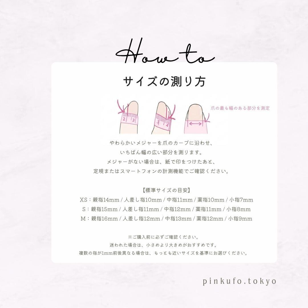 柔らかいメジャーで爪の一番広い部分をカーブに沿って測り、近いサイズをお選びください。