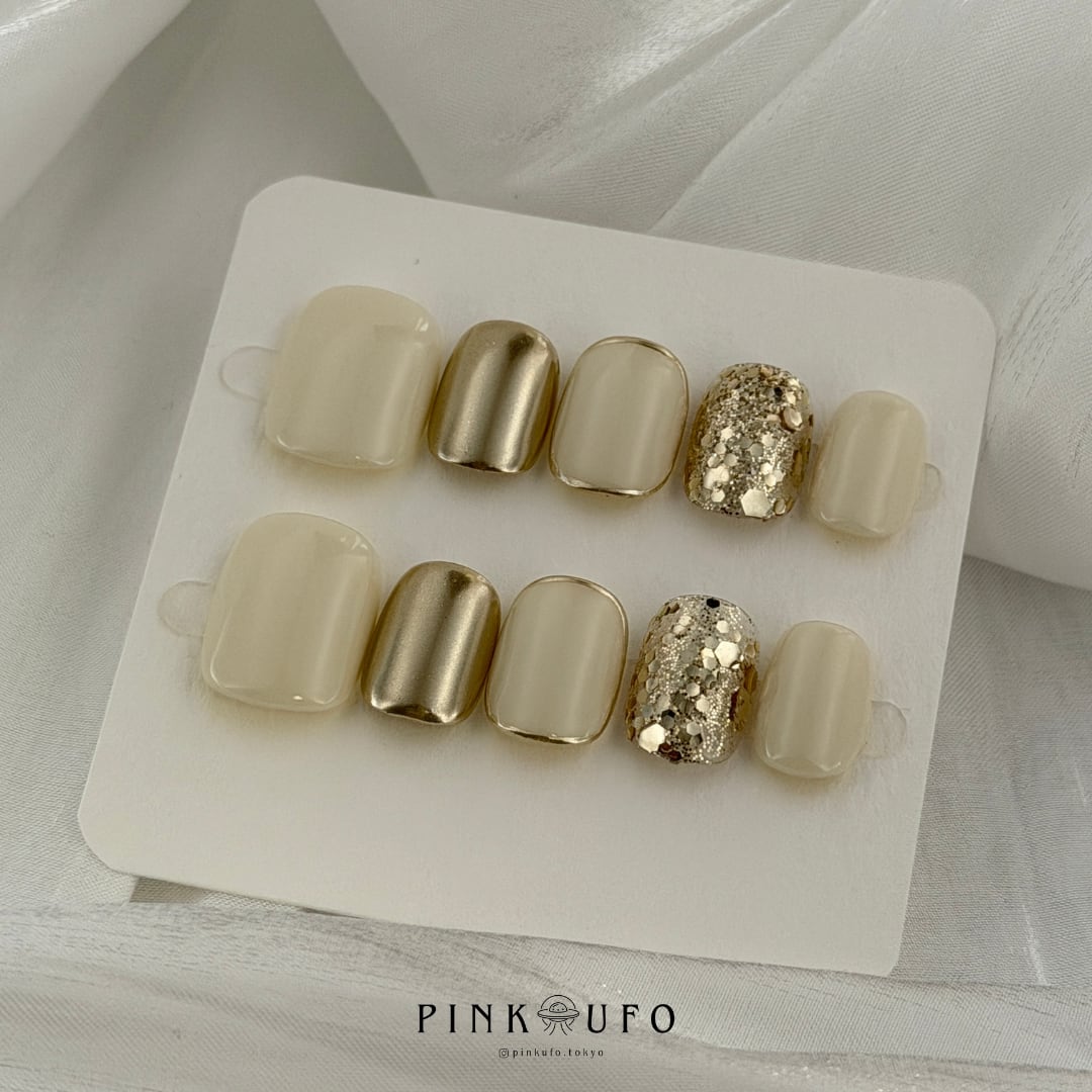 ミルキーなホワイトをベースに、ゴールドのミラー感、シルバーラメ、繊細なフレームデザインを組み合わせたハンドメイドのネイルチップです。
