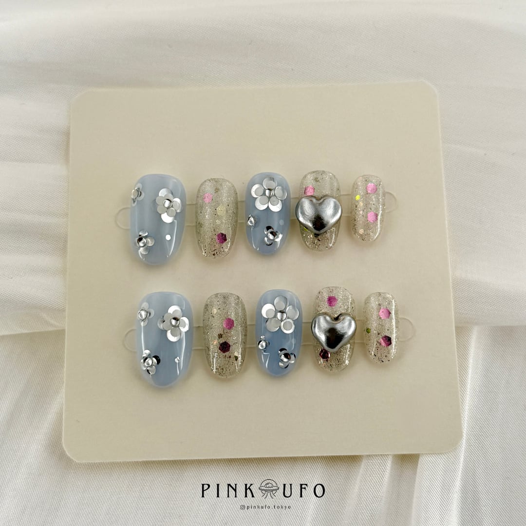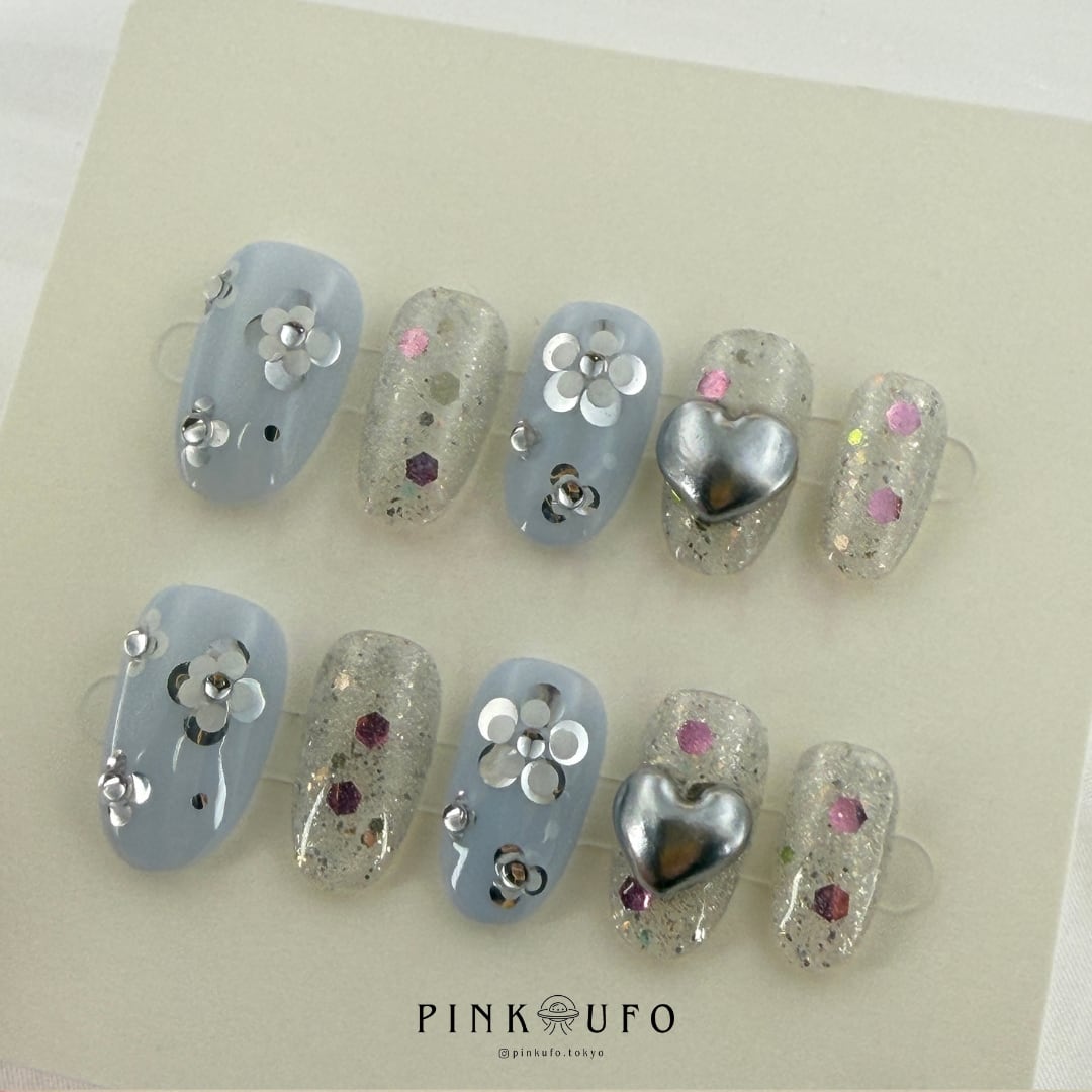 やさしいくすみブルーをベースに、繊細なラメ、ホログラムのきらめき、立体感のあるシルバーハート、フラワーモチーフを組み合わせたハンドメイドのネイルチップです。