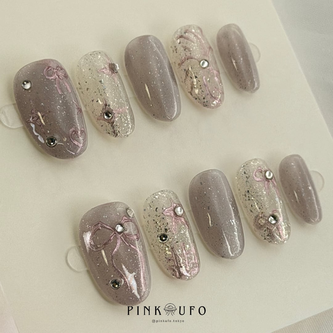 やさしいシアーグレーをベースに、上品なシルバーの艶感、淡いピンクのリボンアート、繊細なラメやハートモチーフを組み合わせたハンドメイドのネイルチップです。