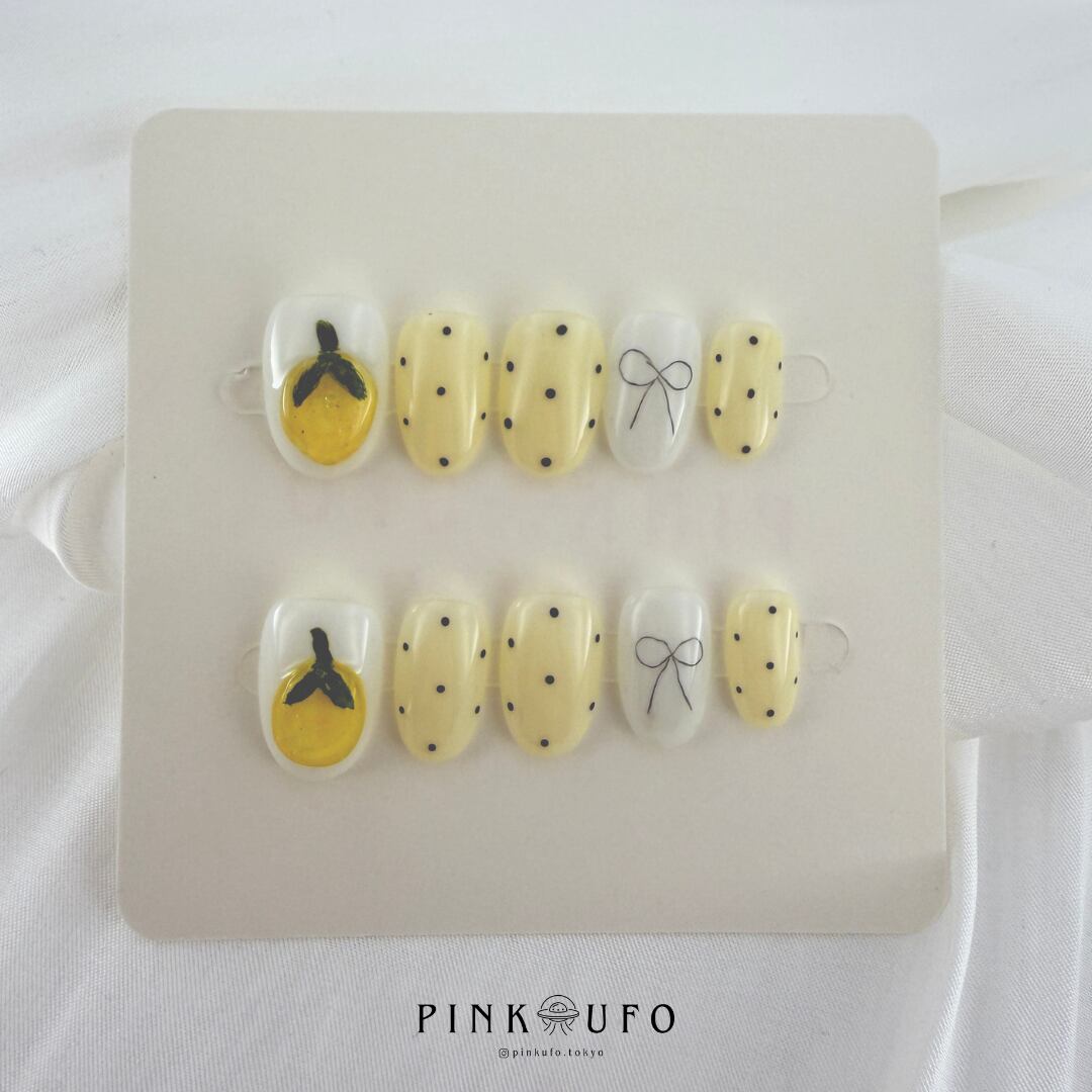 やさしいミルキーホワイトと淡いイエローをベースに、レモンモチーフ、繊細なドット、華奢なリボンアートを組み合わせたハンドメイドのネイルチップです。