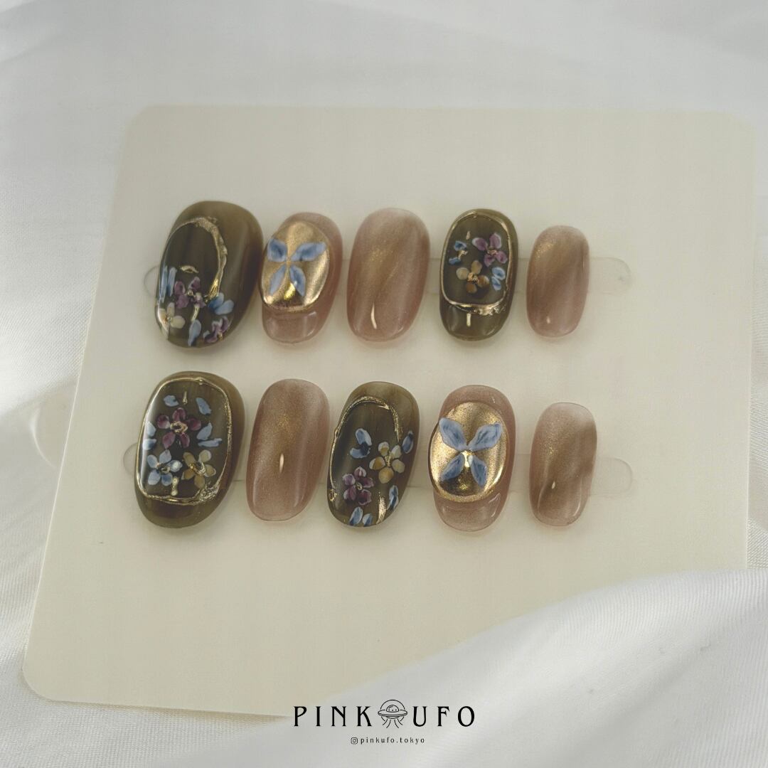 落ち着いたブラウンとやわらかなグレージュをベースに、繊細な手描きフラワー、ゴールドのアクセント、上品な艶感を組み合わせたハンドメイドのネイルチップです。