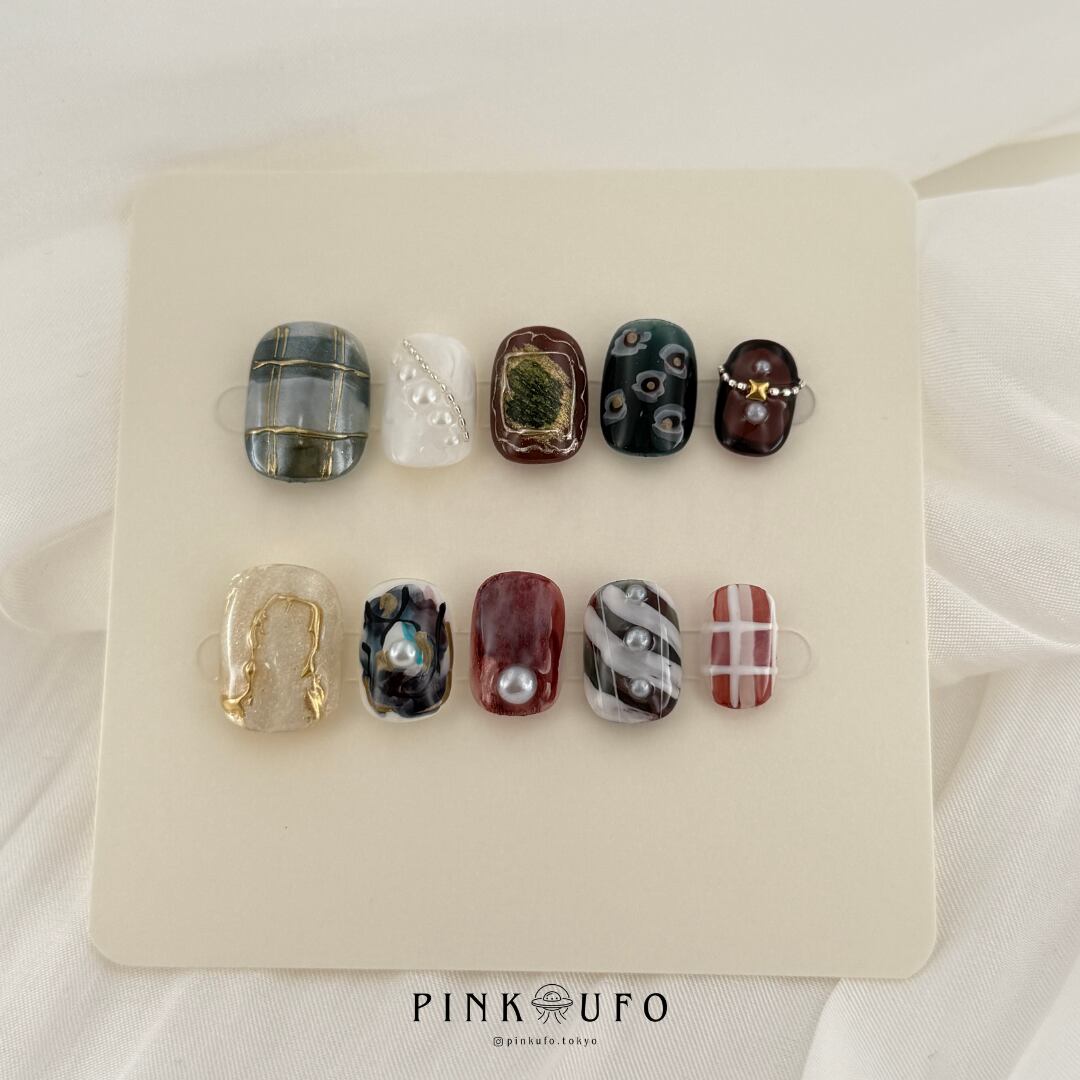ブラウン、グリーン、ボルドー、アイボリーをベースに、チェック、ニュアンスアート、パール、ゴールドライン、立体感のあるディテールを組み合わせたハンドメイドのネイルチップです。