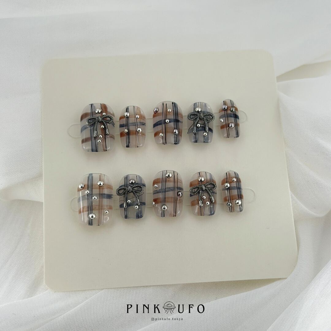 クリアベースに、ブルーとブラウンのチェック柄、繊細なブラックリボン、シルバースタッズを組み合わせたハンドメイドのネイルチップです。